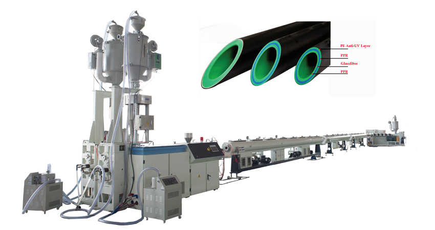 PPR Pipe Production Line|PPR Pipe Making Machine is used to produce single,1,2,3 4 layers pipe, from inside layer to skin layer, it is: ppr raw materials, glassfiber raw materials, ppr raw materials, PE raw materials, the pipe diameter range: 20mm-63mm, 20mm-110mm, etc. This kind of pipe has the features of high strength, high temperature resistance, and the PE skin layer is functioned to anti Ultravoilet, to protect the inner PPR pipe, not sunburning if installed outdoor, which is mostly applied in the fields of building construction, hot water transportation, air conditioner system main pipeline,etc.